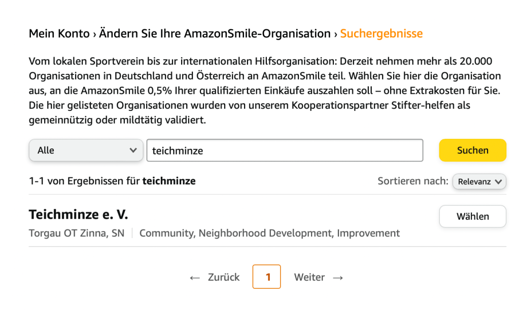 Schritt 3: In den Ergebnissen sollte „Teichminze e. V.“ erscheinen. Hier wählt ihr jetzt Teichminze e. V. als die Organisation aus, die beim Einkauf mit Amazon unterstützt werden soll.